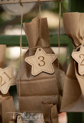 Jako dodatki to 24 woreczki papierowe oraz 24 grawerowane drewniane gwiazdki.