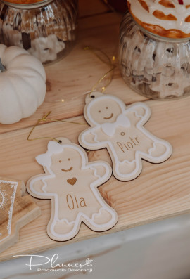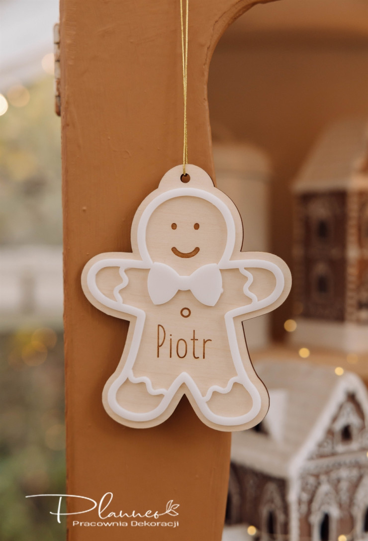 Bombki „Piernikowy Ludzik z imieniem” to niezwykle urocze ozdoby świąteczne inspirowane tradycyjnymi piernikami. Każdy ludzik wykonany jest z naturalnej sklejki z grawerowanymi detalami oraz otoczony obwódką z mlecznej plexi, która nadaje całości elegancji i subtelnego blasku. Personalizowane imię sprawia, że bombka staje się wyjątkową pamiątką i oryginalnym dodatkiem na choinkę, prezent czy stroik.