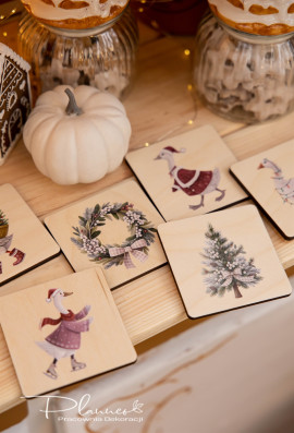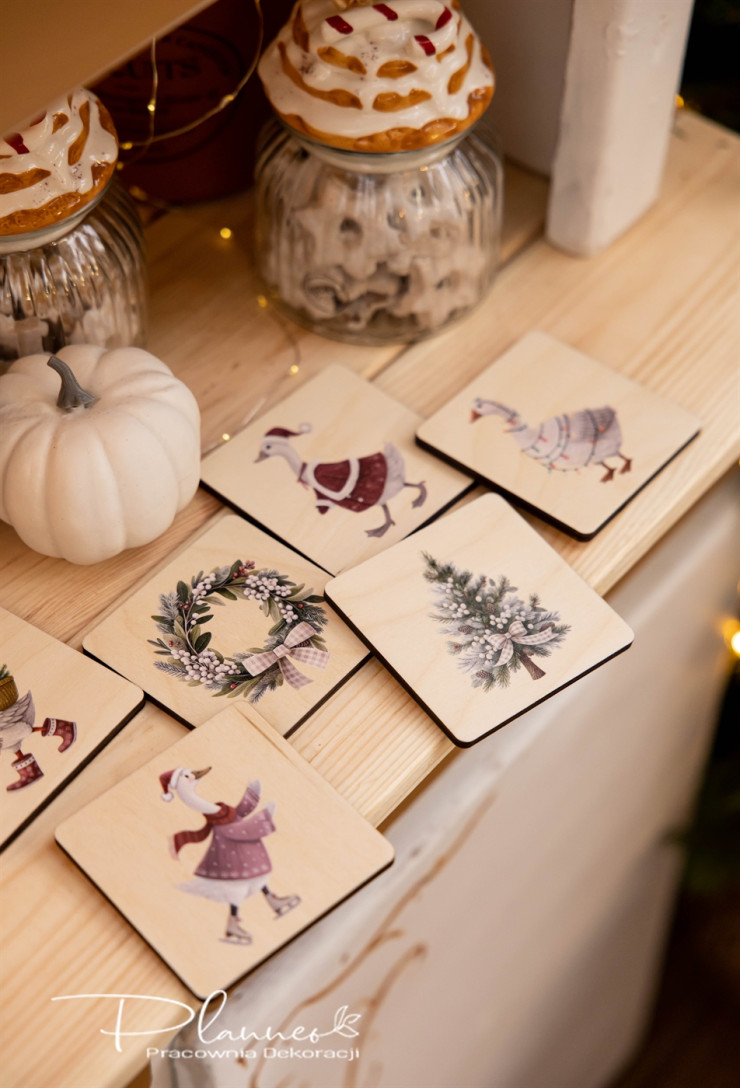 Kwadratowe podkładki z gąskami pięknie dopełnią świąteczny wystrój stołu. Ich naturalne drewno i delikatne ilustracje sprawią, że każde spotkanie przy herbacie lub kakao nabierze wyjątkowego klimatu. Można je także wykorzystać jako dekoracyjny element w kuchni, jadalni lub przy świątecznym stole.