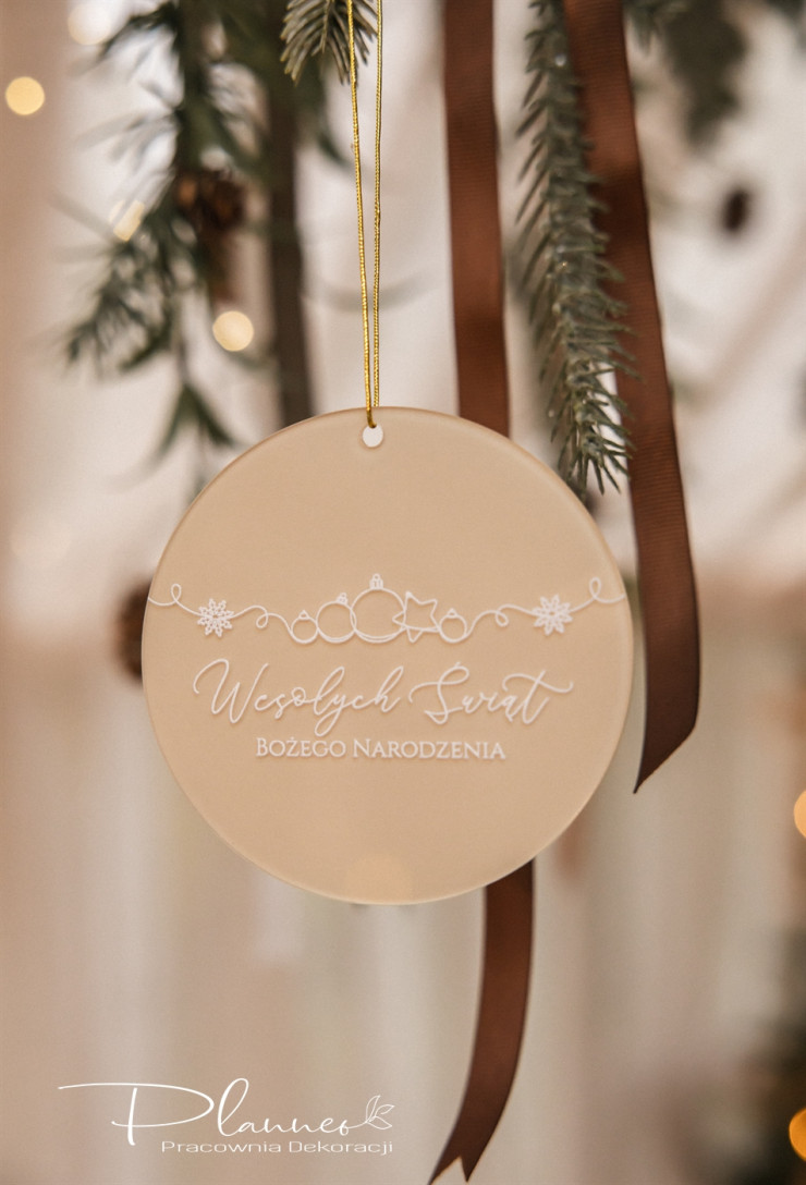Bombka akrylowa z nadrukiem bombek to elegancka i minimalistyczna ozdoba choinkowa, która wprowadzi do wnętrza wyjątkowy, świąteczny nastrój. Wykonana z transparentnej plexi i ozdobiona trwałym nadrukiem UV w kolorze białym, łączy nowoczesny styl z subtelnym urokiem tradycyjnych dekoracji. Dostępna w kilku kolorach tła – beżowym, czerwonym, zielonym i niebieskim – doskonale komponuje się z każdym wystrojem świątecznym.