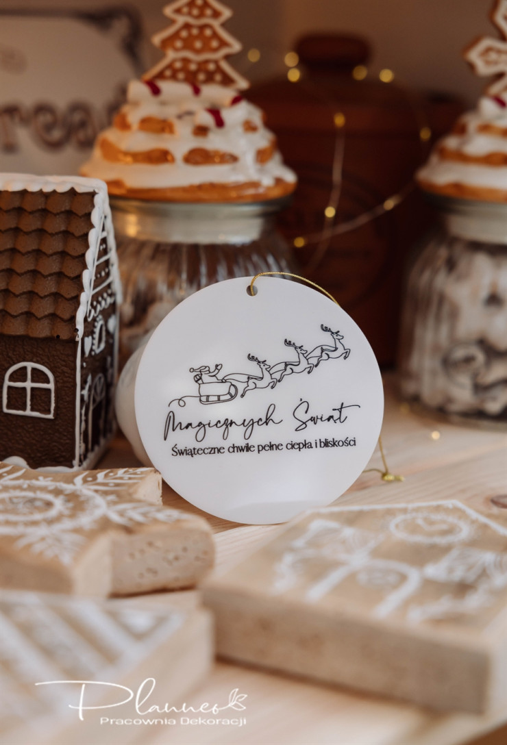 Bombka akrylowa z nadrukiem sań Mikołaja to elegancka i subtelna ozdoba choinkowa, która doskonale oddaje ducha Świąt Bożego Narodzenia. Wykonana z mlecznej plexi, ozdobiona delikatnym czarnym nadrukiem UV przedstawiającym Świętego Mikołaja z reniferami, wprowadza do wnętrza magię, ciepło i nostalgię świątecznego czasu.
