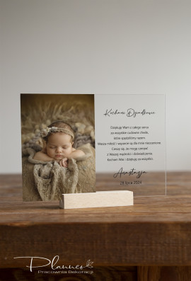Podziękowania dla Chrzestnych kwiaty to piękna i wzruszająca forma wyrażenia wdzięczności w dniu Chrztu Świętego. Ramka wykonana z transparentnej plexi z nadrukiem kwiatowego tła sprawia, że całość prezentuje się niezwykle elegancko i dekoracyjnie. Delikatne wzory kwiatowe nadają projektowi wyjątkowego charakteru, podkreślając podniosłość chwili. To pamiątka, która łączy w sobie subtelność natury i elegancję nowoczesnego wzornictwa.