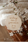 Zestaw zawiera 14 tabliczek: miesiące od 1-11, tabliczkę z napisem "Roczek" oraz dwie dodatkowe tabliczki z dowolnym tekstem. Przykładowe napisy: Witaj na świecie, już jestem, nasz cały świat, nasze małe szczęście, córeczka, synek, imię dziecka itp.