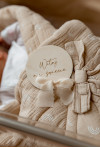 Kolor na zdjęciu to naturalne drewno. Wstążki do wyboru to pudrowy róż, beż, krem, zieleń, dusty blue.