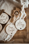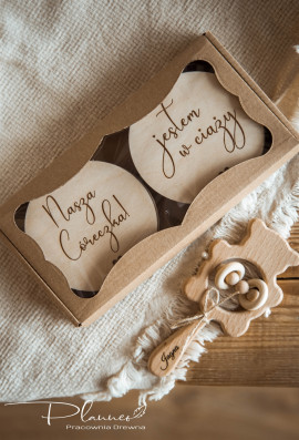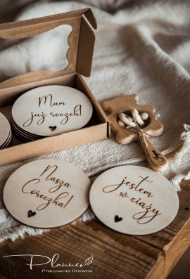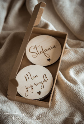 Komplet zawiera 14 tabliczek: miesiące od 1-11, tabliczkę z napisem "Mam już roczek" oraz dwie dodatkowe tabliczki z dowolnym tekstem. Przykładowe napisy: Witaj na świecie, już jestem, nasz cały świat, nasze małe szczęście, córeczka, synek, imię dziecka itp.