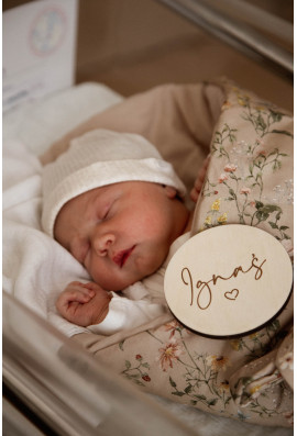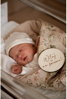 Zestaw zawiera 14 tabliczek: miesiące od 1-11, tabliczkę z napisem "Roczek" oraz dwie dodatkowe tabliczki z dowolnym tekstem. Przykładowe napisy: Witaj na świecie, już jestem, nasz cały świat, nasze małe szczęście, córeczka, synek, imię dziecka itp.