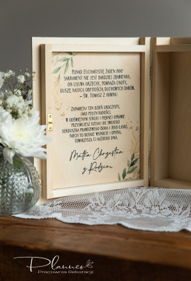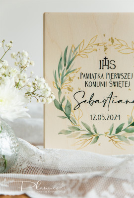 Pamiątka Komunii Świętej szkatułka na Biblię złote liście