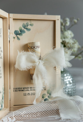 Szkatułka na pieniądze. Ze wstążką szyfonową. Kolor do wyboru to: biel, ecru, beż, zieleń, róż.