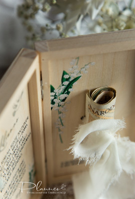 Szkatułka na pieniądze. Ze wstążką szyfonową. Kolor do wyboru to: biel, ecru, beż, zieleń, róż.