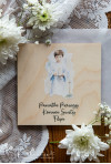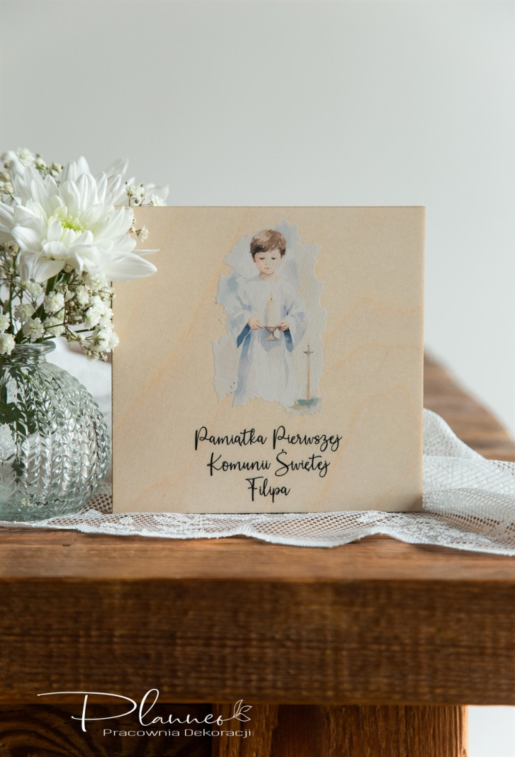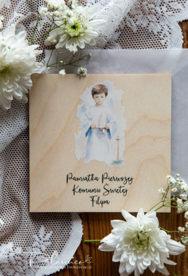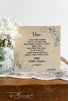 Wyjątkowy telegram na Pierwszą Komunię Święta - wykonany z wysokiej jakości sklejki z drzew liściastych o grubości 3 mm z nadrukiem.