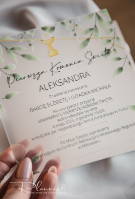 Eleganckie zaproszenie na Komunię Świętą z subtelnym motywem zielonych liści oraz kielicha z hostią. To wyjątkowy sposób na poinformowanie bliskich o tym ważnym wydarzeniu i stworzenie niezapomnianej pamiątki.