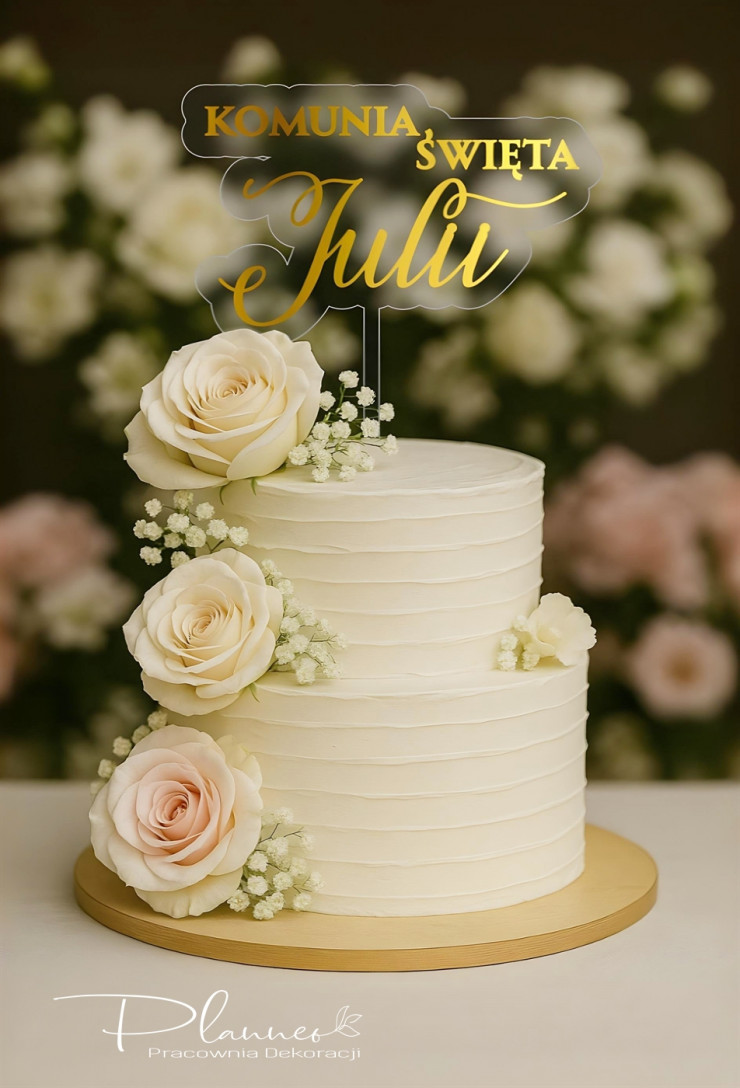 Nowoczesna forma – Transparentna plexi nadaje topperowi lekkości i współczesnego charakteru. Nadrukowana grafika sprawia wrażenie unoszącej się nad tortem. Dzięki temu dekoracja nie przytłacza, a jednocześnie pięknie się wyróżnia. To efektowne uzupełnienie każdego komunijnego tortu.