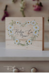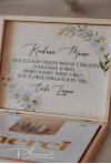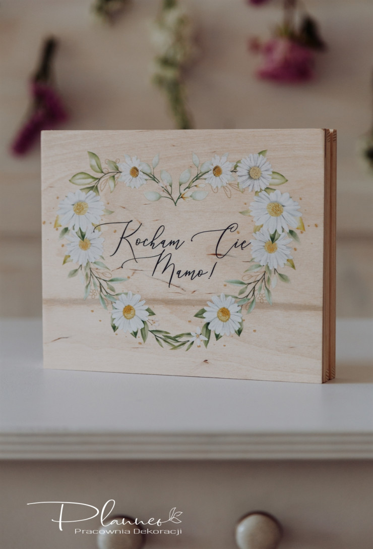 Wyjątkowe drukowane drewniane pudełko na czekoladki Merci ze wzorem stokrotki.
