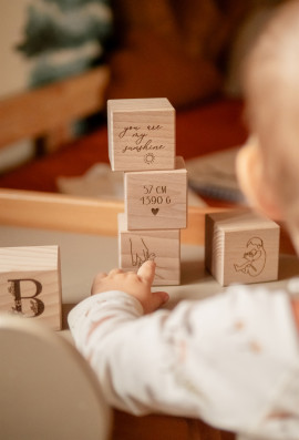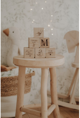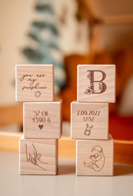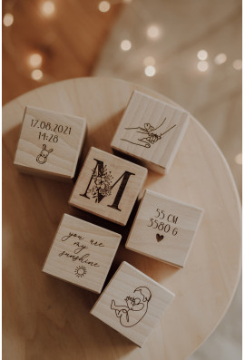 Wyjątkowa metryczka składająca się z 6 kostek. 2 kostki zawierają grafikę, jedna literkę imienia w liścianym wzorze, 2 kostki to waga, cm, godzina oraz data, 1 kostka z napisem my little girl lub my little boy.