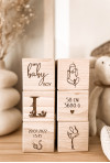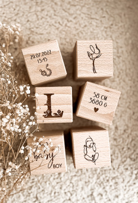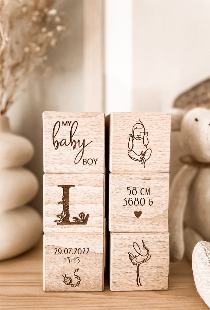 Wyjątkowa metryczka składająca się z 6 kostek. 2 kostki zawierają grafikę, jedna literkę imienia w liścianym wzorze, 2 kostki to waga, cm, godzina oraz data, 1 kostka z napisem my baby girl lub my baby boy.