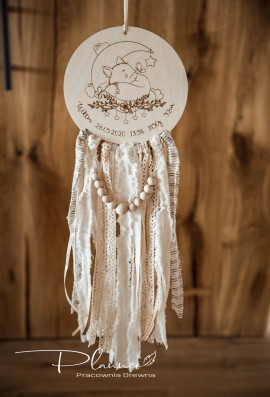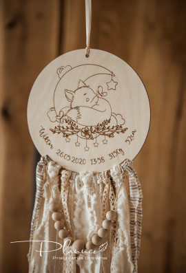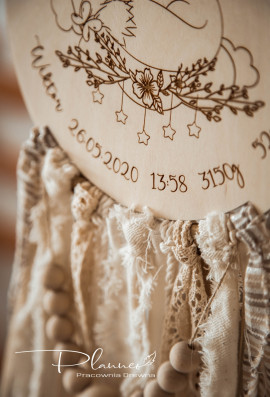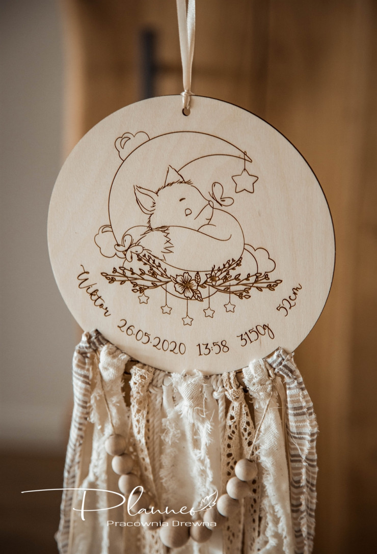 Wyjątkowy łapacz snów w formie metryczki z imieniem dziecka - wykonany z wysokiej jakości sklejki z drzew liściastych o grubości 3 mm ozdobi pokój i łóżeczko dziecka!