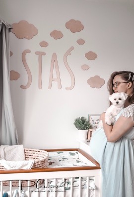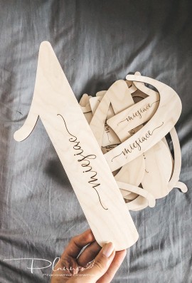Drewniana literka z imieniem dziecka, wykonane z wysokiej jakości sklejki 6 mm. Imię dziecka wykonane jest z mlecznej białej plexi.