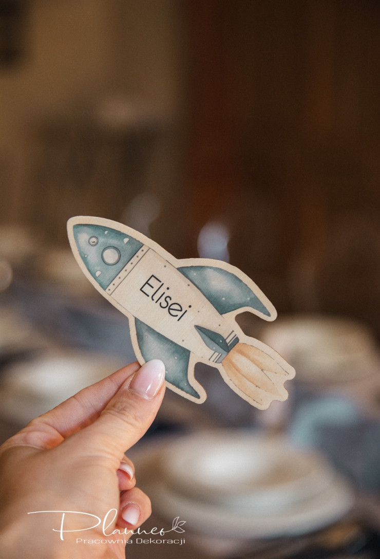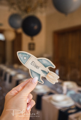 Wyjątkowa winietka na roczek w kształcie rakiety, z nadrukowanym wzorem i imieniem gościa.