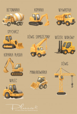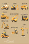Wzory: Betoniarka, Koparka, Wywrotka, Spychacz, Dźwig samojezdny, Wózek Widłowy, Koparka Płaska, Miniładowarka, Dźwig, Walec