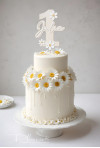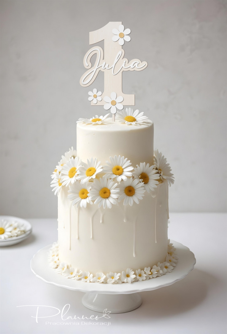 Wyjątkowy topper urodzinowy - wykonany z wysokiej jakości sklejki z drzew liściastych o grubości 3 mm oraz imieniem i stokrotkami z plexi ozdobi tort lub inne słodkości.
