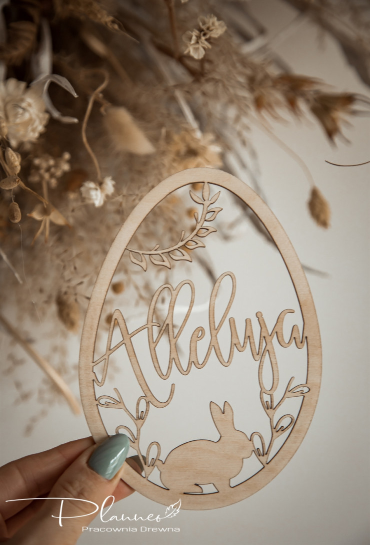 Świąteczna atmosfera w każdym szczególe – Napis "Alleluja" przypomina o radosnym przesłaniu Wielkanocy, budując ciepłą atmosferę w domu. Ozdoba jest idealna do dekoracji podczas rodzinnych spotkań czy wielkanocnych śniadań. Jej subtelny design przyciąga uwagę, ale nie przytłacza, co czyni ją doskonałym akcentem świątecznym. To także świetny pomysł na drobny upominek dla bliskich.