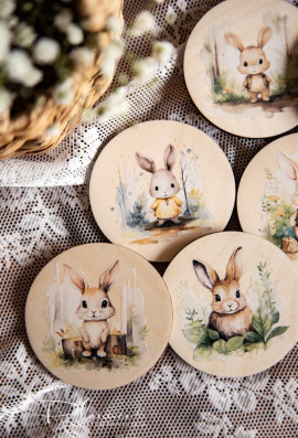 Urocze podkładki pod kubek z motywem akwarelowych zajączków to doskonały dodatek do wielkanocnego stołu. Każda podkładka przedstawia innego króliczka w pastelowych kolorach, nadając aranżacji ciepły i przytulny charakter.