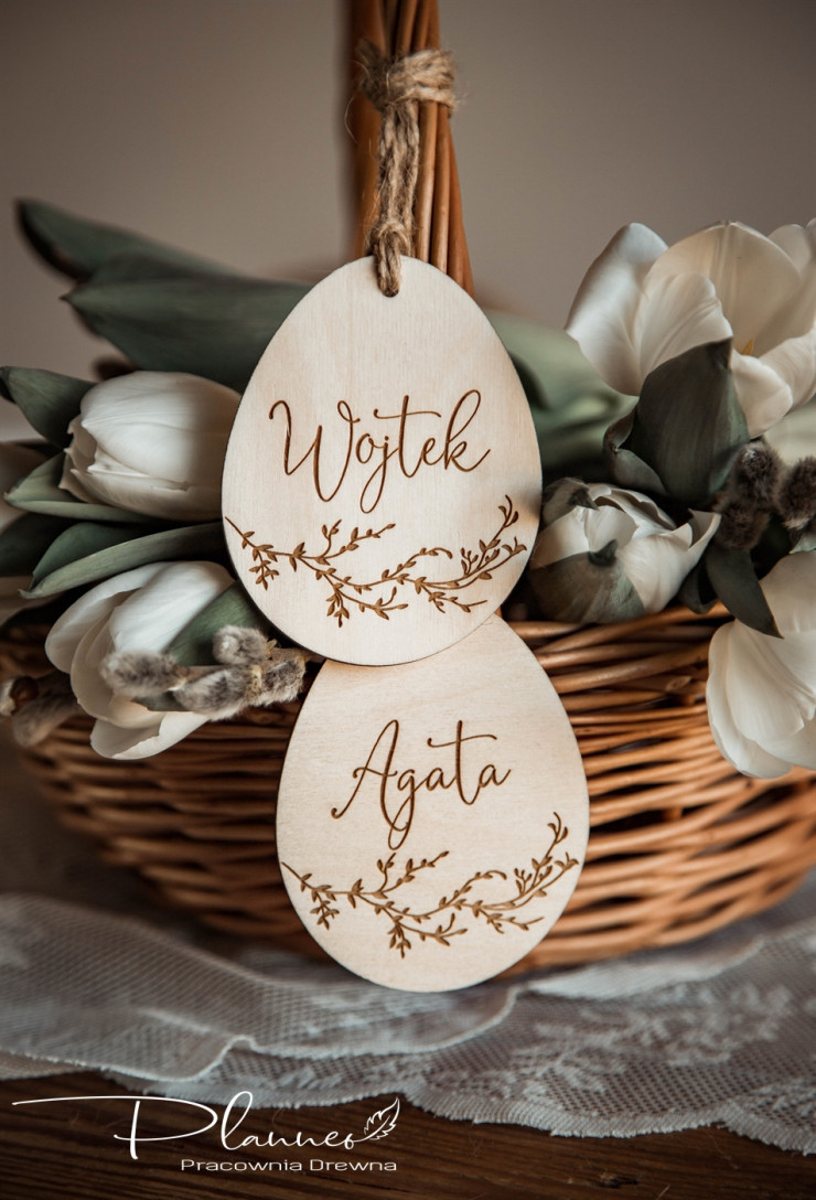 Personalizacja – Możliwość wygrawerowania imienia sprawia, że każda zawieszka staje się unikalnym dodatkiem, idealnym do ozdobienia wielkanocnego stołu, koszyczka czy świątecznej dekoracji.