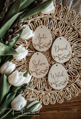Eleganckie wielkanocne zawieszki w kształcie jajka, wykonane z wysokiej jakości sklejki o grubości 3 mm. Każde jajko posiada precyzyjny grawer laserowy z wygrawerowanym imieniem oraz delikatnym motywem gałązki, co nadaje im wyjątkowego, spersonalizowanego charakteru.