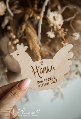 Kurki Moje Pierwsze Alleluja to urocza dekoracja i pamiątka pierwszej Wielkanocy dziecka. Wykonane z wysokiej jakości sklejki o grubości 3 mm, łączą w sobie naturalny urok drewna z eleganckim grawerem. Na każdej kurce znajduje się wygrawerowane imię dziecka oraz rok, co czyni je wyjątkową, personalizowaną ozdobą.