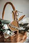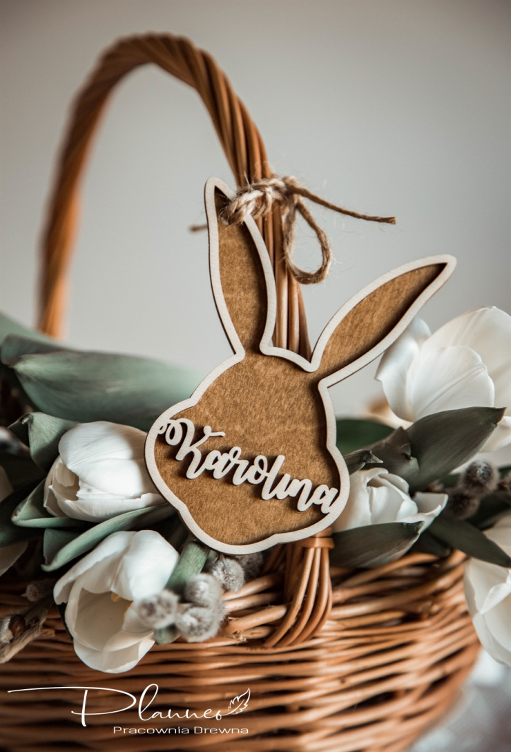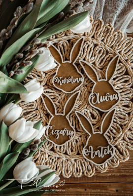 Głowa zajączka z imieniem to doskonały wybór na świąteczny stół i wielkanocne dekoracje. Jej uroczy design podkreśla atmosferę świąt, wprowadzając do wnętrza wiosenny, radosny klimat. Może być wykorzystana jako indywidualna winietka dla gości lub jako ozdoba świątecznego koszyczka.